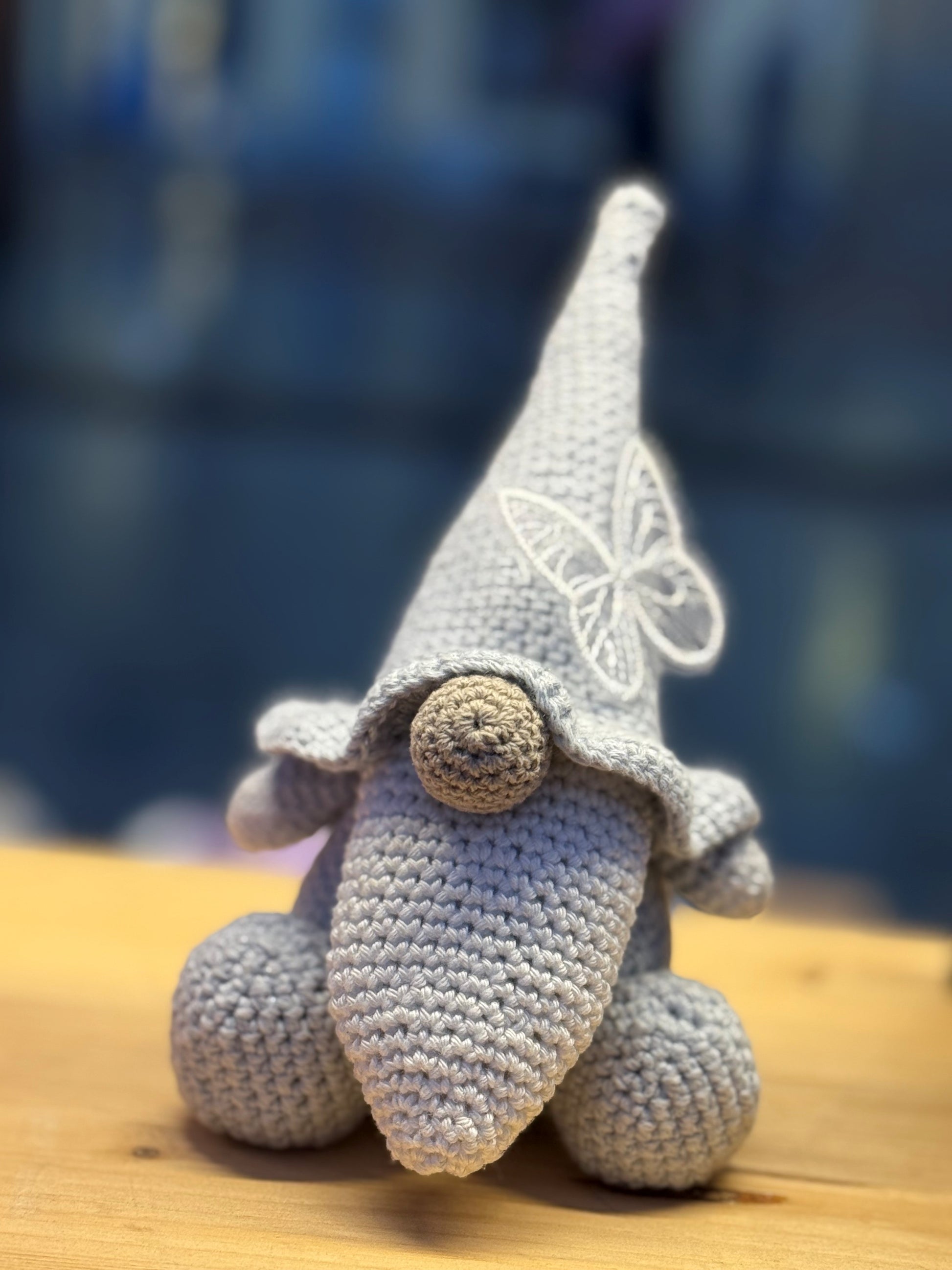 Nano profumato alla lavanda, realizzato all'uncinetto con dettaglio di una farfalla.